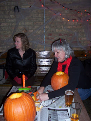 I'm happy to say that we all made it through the carving with our fingers intact. As usual, I was there in a supervisory capacity. It turned out to be the nicest night all week and we were able to sit outside (a major plus for the smokers in the group) Here's a few shots. . .